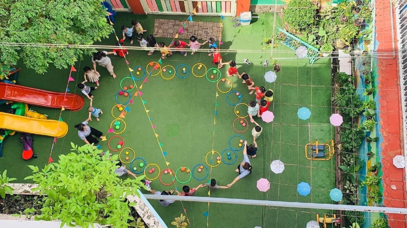 - Khu vực sân chơi ngoài trời và sảnh trong được tận dụng không gian rộng lớn và thoáng đãng. Đây là nơi các bé có cơ hội khám phá, phát triển kỹ năng xã hội và thể chất một cách tự nhiên.